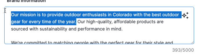 - Highlight the text you want to edit in the Brand Value Proposition or Brand Information field. Then click the AI Sparkle.