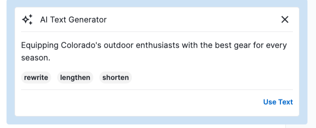 - The text generator tool is available on any text field that has the "AI" icon in the top-right corner. Click on that icon to open the text generator. NOTE: This will overwrite any previous text in the field. To edit a specific section of text, highlight the text you'd like to edit before clicking the "AI" icon. See how here.