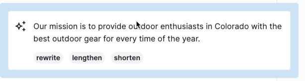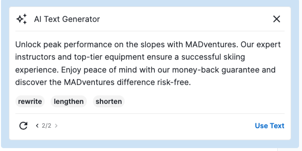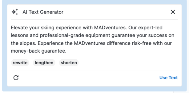 - The generator will take a few seconds to generate the text content. When it is generated, you can choose to either lengthen, shorten, or rewrite the text, or click the refresh icon to resubmit the initial prompt.