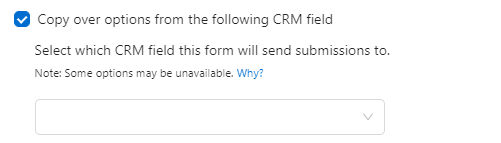 If the field you're editing has options (dropdown, radio button, or checkbox type fields), a checkbox will be available to "Copy over options from the following CRM field". This will pull in the options in the selected CRM field for easy setup. You're welcome to change how these options display on your form by changing the field label.
