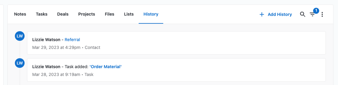 The History tab is where you’ll see recent History associated with that contact. This gives you a good idea of what actions have been taken for this contact by anyone within your business.